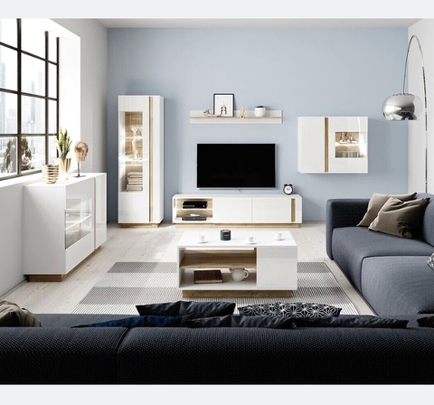 Gabinete de almacenamiento de TV para sala de estar blanco moderno, unidades de TV y mesa de centro con estante de vidrio