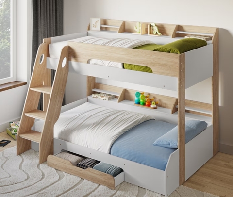 Litera blanca doble sobre cama completa para niños y niños con almacenamiento y estantería para libros